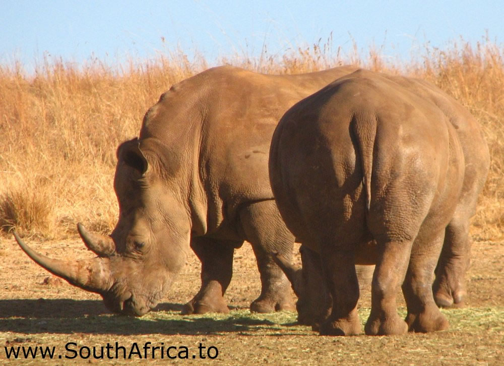 There are two types of rhino - white rhino and black rhino; the difference between them being that the black rhino is more aggressive and has a pointed mouth to browse more easily from bushes, whilst the white rhino is less aggressive and has a wider mouth for grazing.