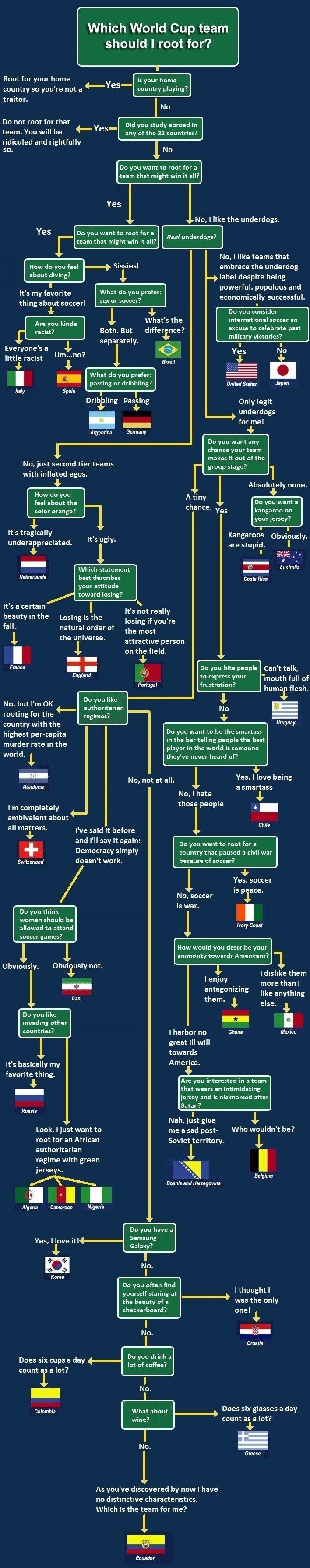 The Purple Shall Rule! Given the ongoing Bafana Bafana tragedy, it's especially difficult for us South Africans to decide which team to support. Here's a flowchart to help you decide. And if you later want to visit that country, you know where to book your flights!