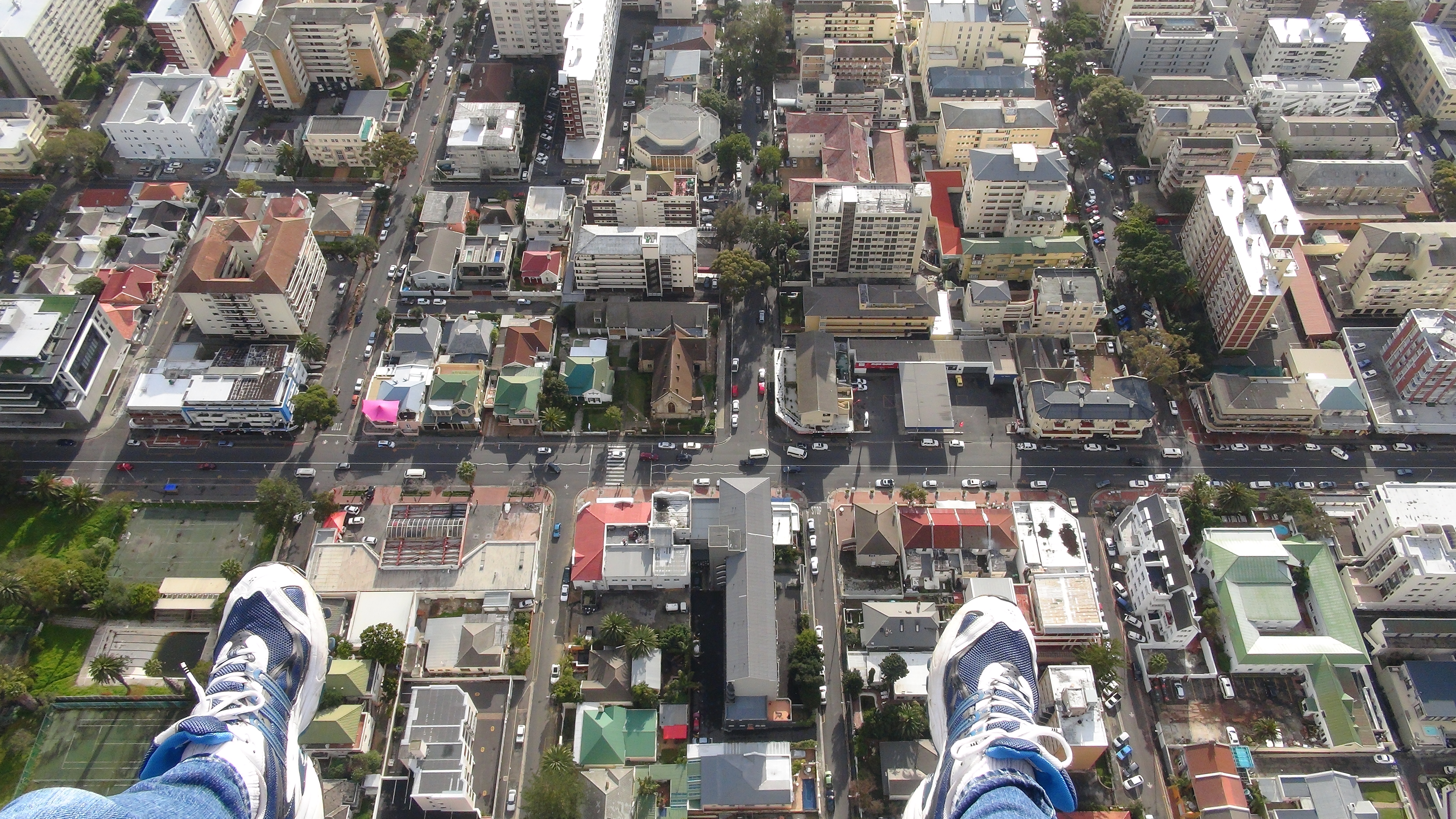 Running from right to left in the following photo is Sea Point Main Road. The grey-roofed building in between my legs is the Craigmore block of flats. The brown-roofed church across Main Road from Craigmore flats is the Sea Point Evangelical Congregational Church.